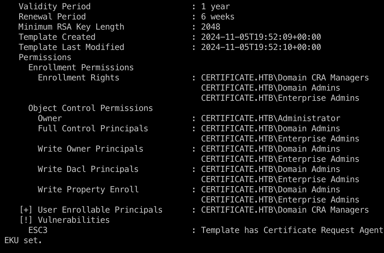 1 | certipy find -u lion.sk -p '!QAZ2wsx' -target certificate.htb -stdout -vulnerable |
