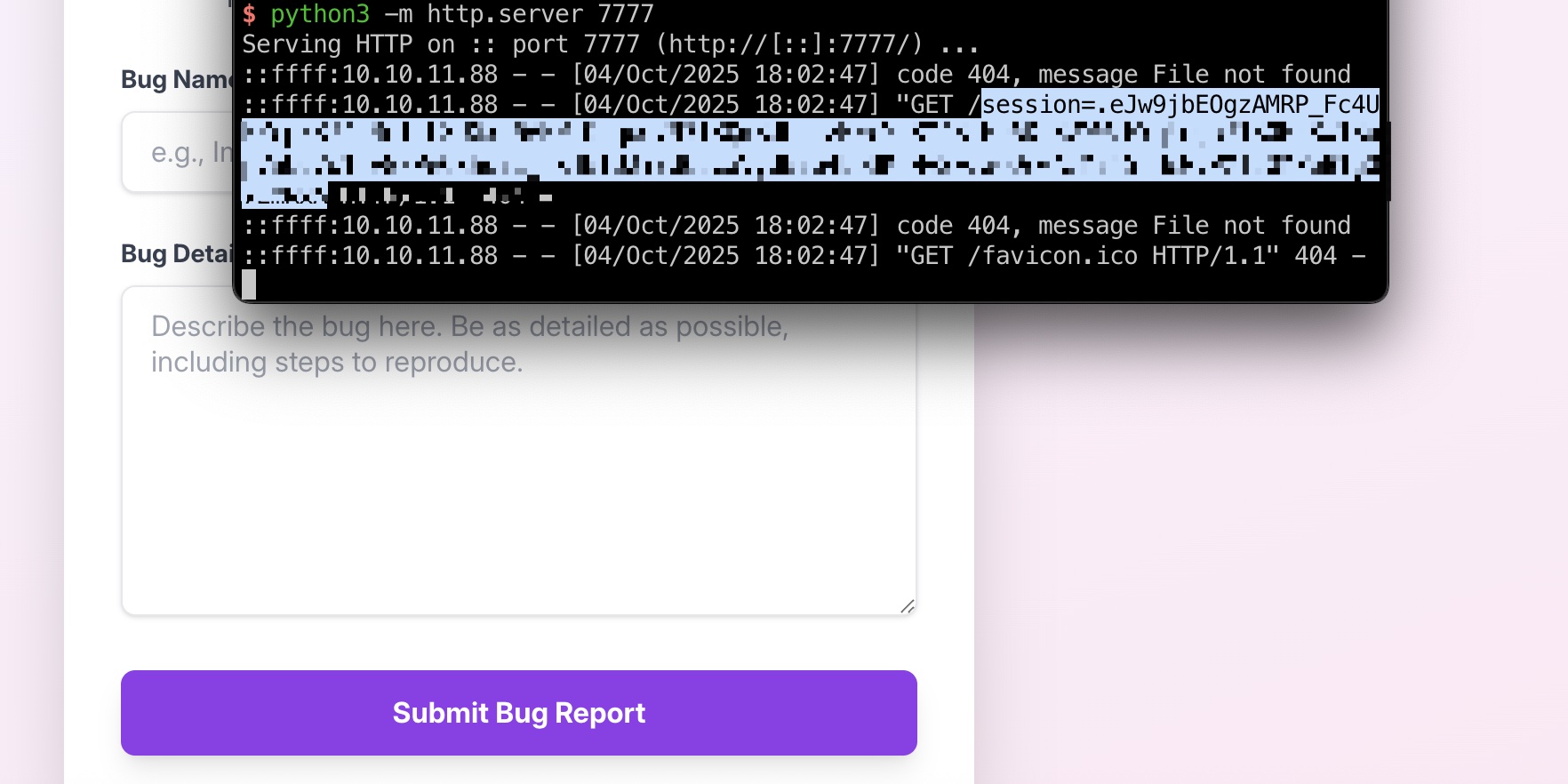 存在交互的地方就Report Bug功能,提交信息会有bot自动查看,常规XSS,得到一个cookie: