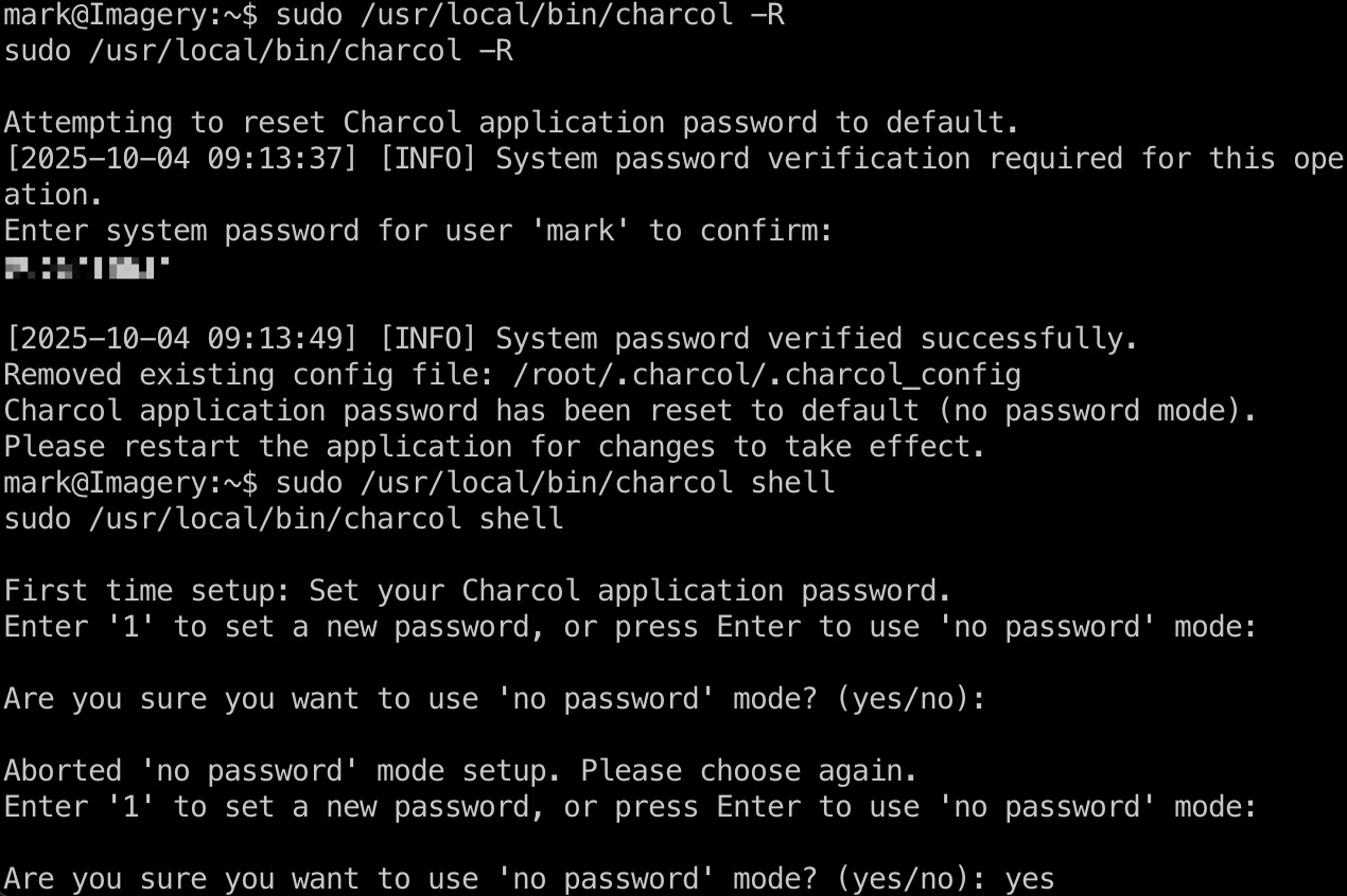 可以sudo运行charcol,测试发现shell功能需要密码,但可以直接重置密码: