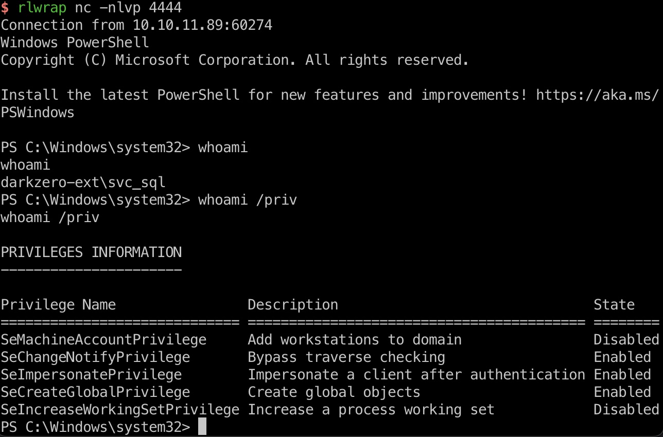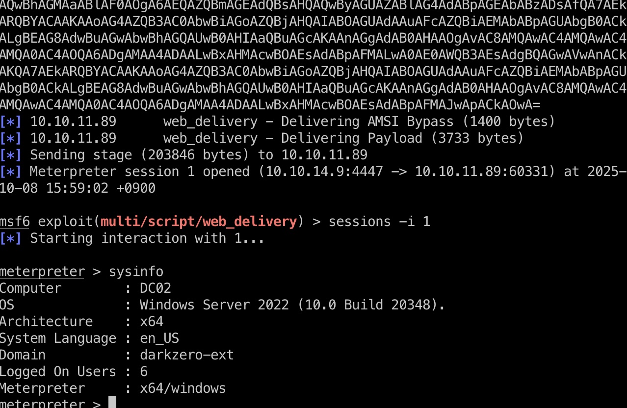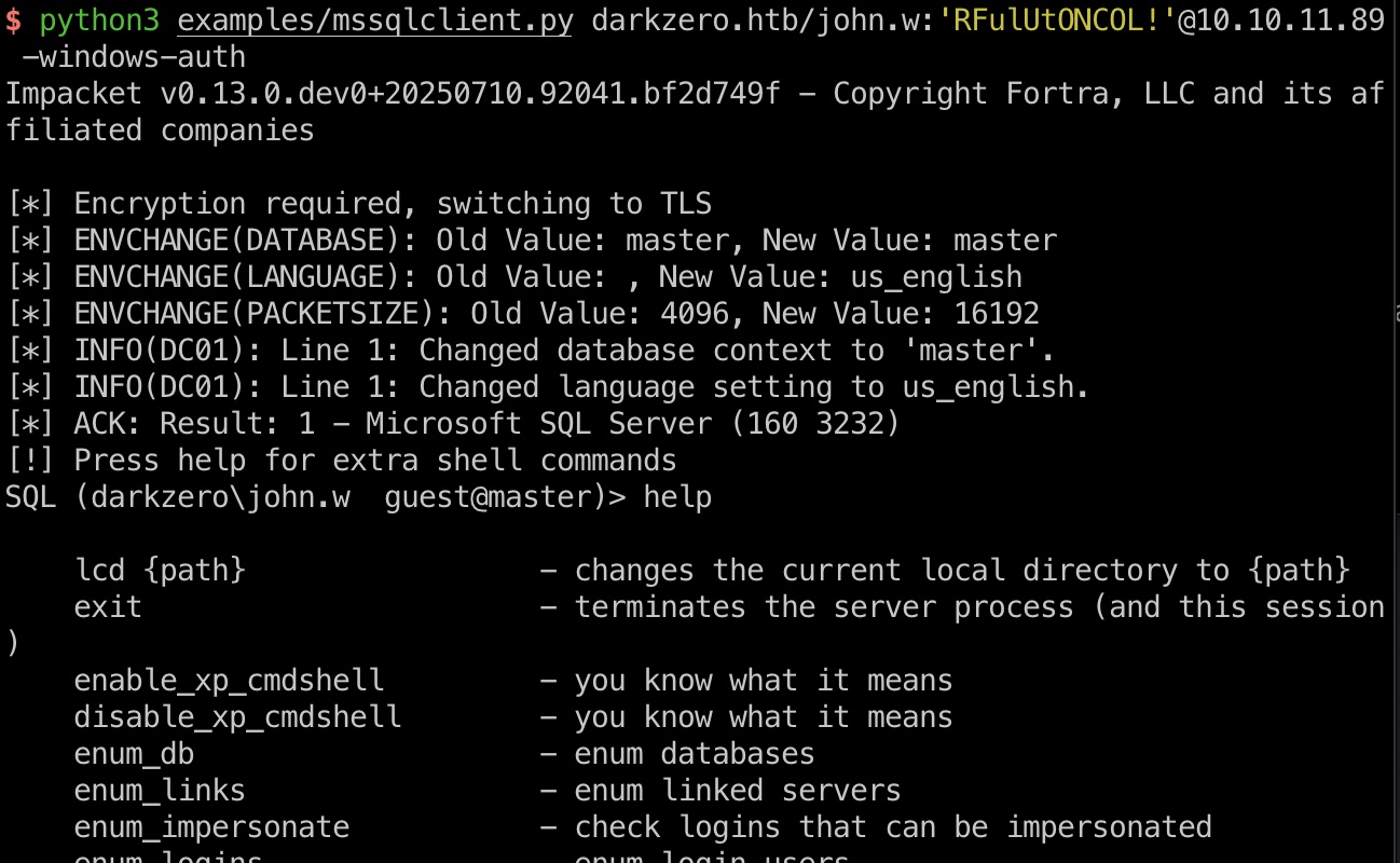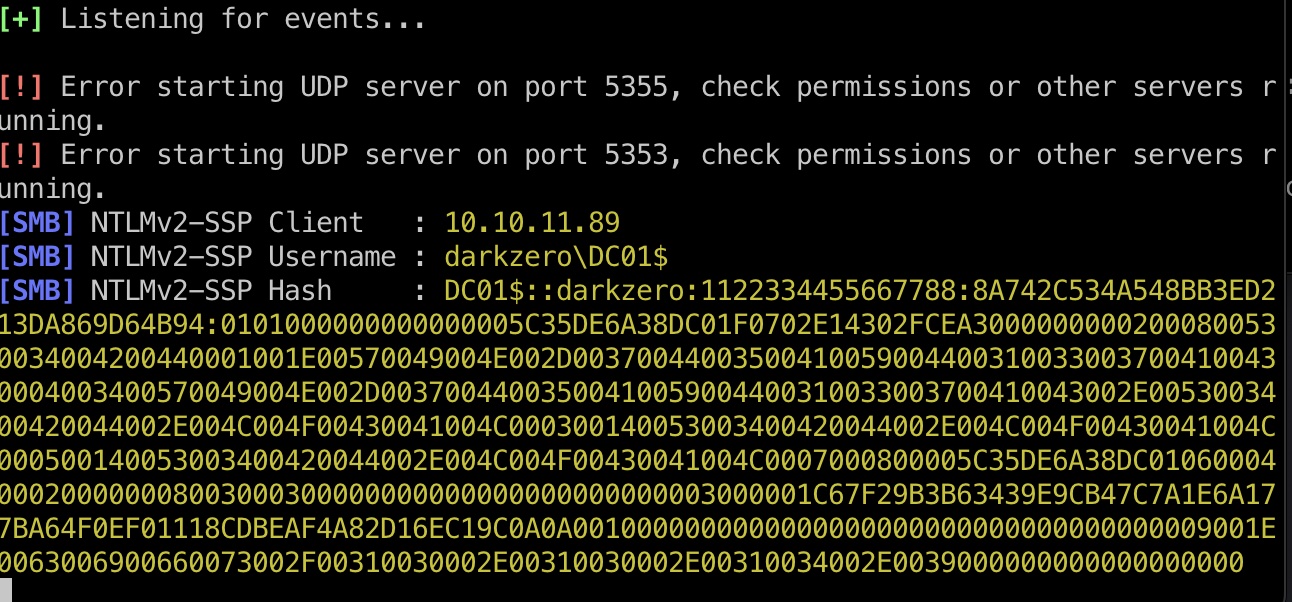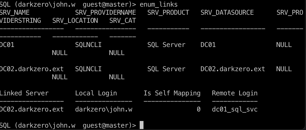 $ nmap -sC -sV -Pn 10.10.11.89 Starting Nmap 7.95 ( https://nmap.org ) at 2025-10-08 15:35 JST Nmap scan report for 10.10.11.89 Host is up (0.19s latency). Not shown: 988 filtered tcp ports (no-response) PORT STATE SERVICE VERSION 53/tcp open domain Simple DNS Plus 88/tcp open kerberos-sec Microsoft Windows Kerberos (server time: 2025-10-08 13:10:52Z) 139/tcp open netbios-ssn Microsoft Windows netbios-ssn 389/tcp open ldap Microsoft Windows Active Directory LDAP (Domain: darkzero.htb0., Site: Default-First-Site-Name) | ssl-cert: Subject: commonName=DC01.darkzero.htb | Subject Alternative Name: othername: 1.3.6.1.4.1.311.25.1:<unsupported>, DNS:DC01.darkzero.htb | Not valid before: 2025-07-29T11:40:00 |_Not valid after: 2026-07-29T11:40:00 |_ssl-date: TLS randomness does not represent time 445/tcp open microsoft-ds? 464/tcp open kpasswd5? 593/tcp open ncacn_http Microsoft Windows RPC over HTTP 1.0 636/tcp open ssl/ldap Microsoft Windows Active Directory LDAP (Domain: darkzero.htb0., Site: Default-First-Site-Name) |_ssl-date: TLS randomness does not represent time | ssl-cert: Subject: commonName=DC01.darkzero.htb | Subject Alternative Name: othername: 1.3.6.1.4.1.311.25.1:<unsupported>, DNS:DC01.darkzero.htb | Not valid before: 2025-07-29T11:40:00 |_Not valid after: 2026-07-29T11:40:00 1433/tcp open ms-sql-s Microsoft SQL Server 2022 16.00.1000.00; RTM |_ms-sql-ntlm-info: ERROR: Script execution failed (use -d to debug) |_ssl-date: 2025-10-08T13:12:17+00:00; +6h33m14s from scanner time. | ssl-cert: Subject: commonName=SSL_Self_Signed_Fallback | Not valid before: 2025-10-08T13:10:02 |_Not valid after: 2055-10-08T13:10:02 |_ms-sql-info: ERROR: Script execution failed (use -d to debug) 3268/tcp open ldap Microsoft Windows Active Directory LDAP (Domain: darkzero.htb0., Site: Default-First-Site-Name) |_ssl-date: TLS randomness does not represent time | ssl-cert: Subject: commonName=DC01.darkzero.htb | Subject Alternative Name: othername: 1.3.6.1.4.1.311.25.1:<unsupported>, DNS:DC01.darkzero.htb | Not valid before: 2025-07-29T11:40:00 |_Not valid after: 2026-07-29T11:40:00 3269/tcp open ssl/ldap Microsoft Windows Active Directory LDAP (Domain: darkzero.htb0., Site: Default-First-Site-Name) | ssl-cert: Subject: commonName=DC01.darkzero.htb | Subject Alternative Name: othername: 1.3.6.1.4.1.311.25.1:<unsupported>, DNS:DC01.darkzero.htb | Not valid before: 2025-07-29T11:40:00 |_Not valid after: 2026-07-29T11:40:00 |_ssl-date: TLS randomness does not represent time 5985/tcp open http Microsoft HTTPAPI httpd 2.0 (SSDP/UPnP) |_http-title: Not Found |_http-server-header: Microsoft-HTTPAPI/2.0 Service Info: Host: DC01; OS: Windows; CPE: cpe:/o:microsoft:windows