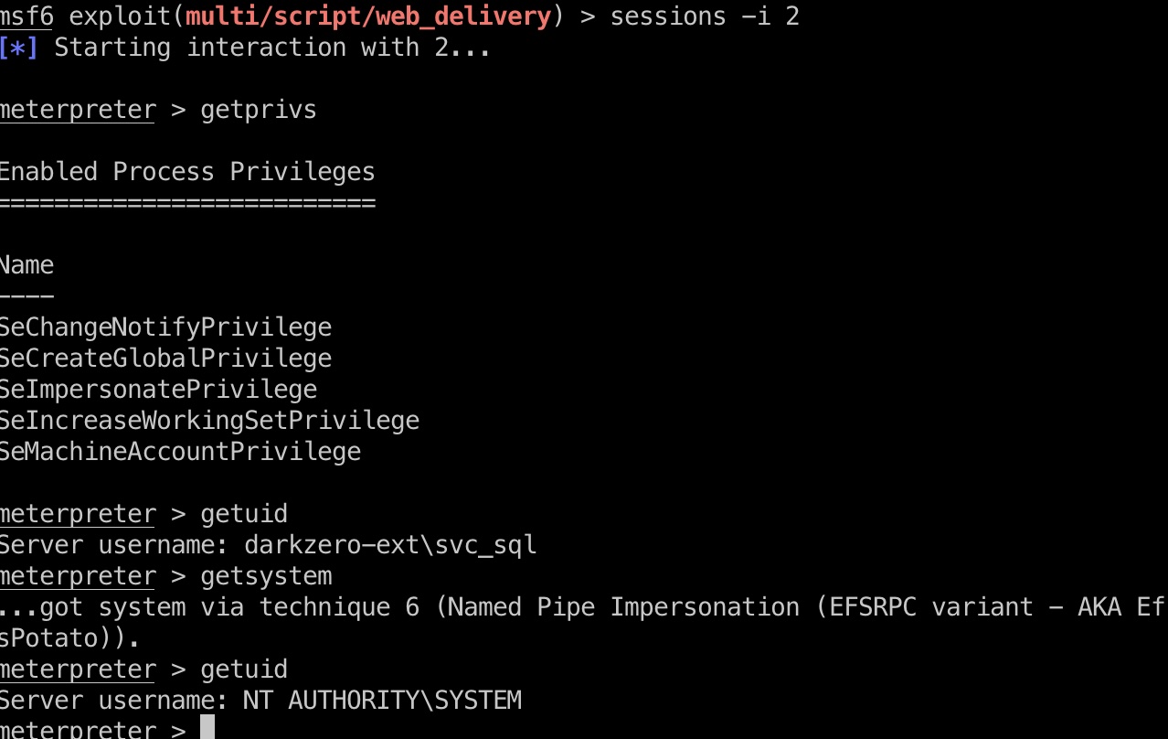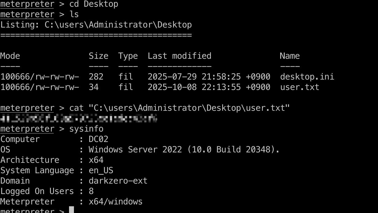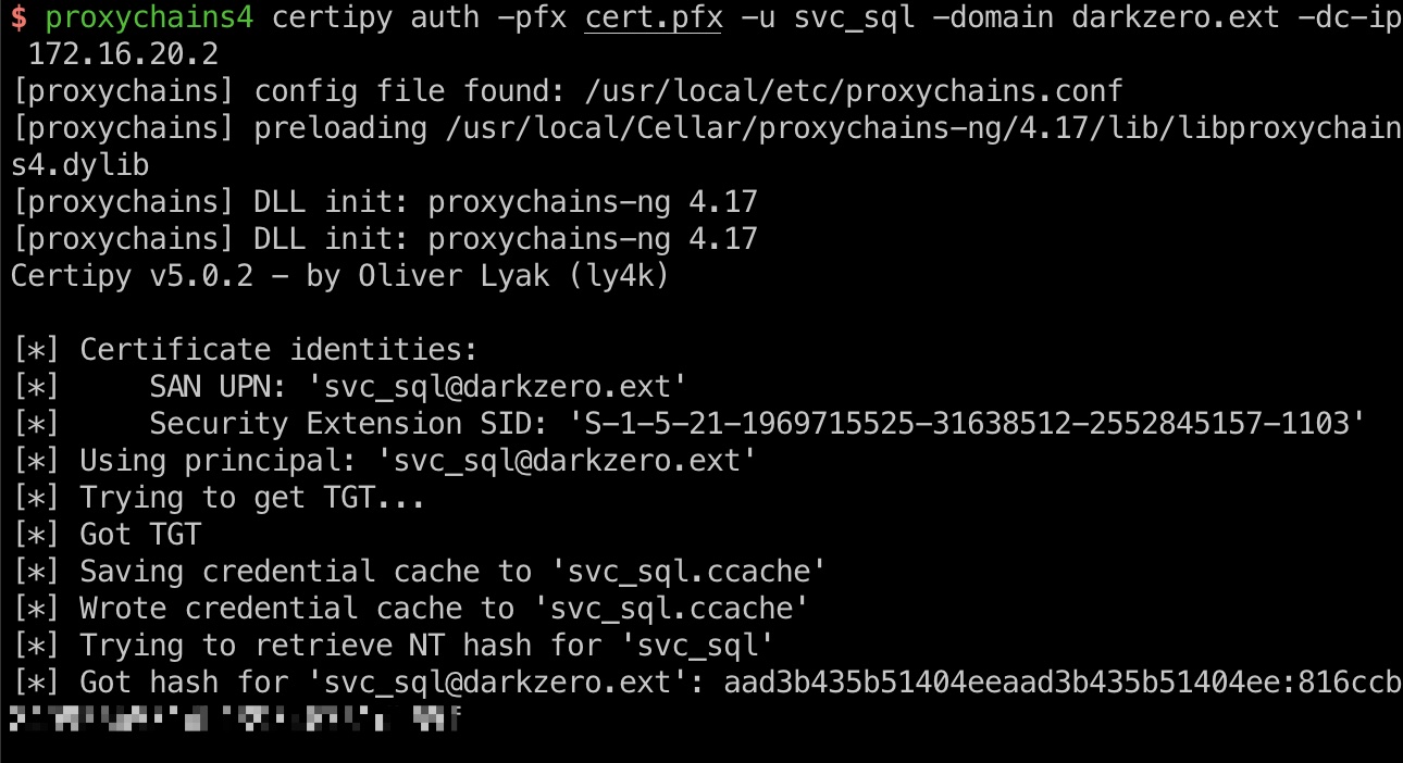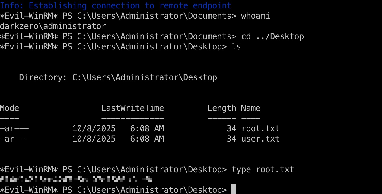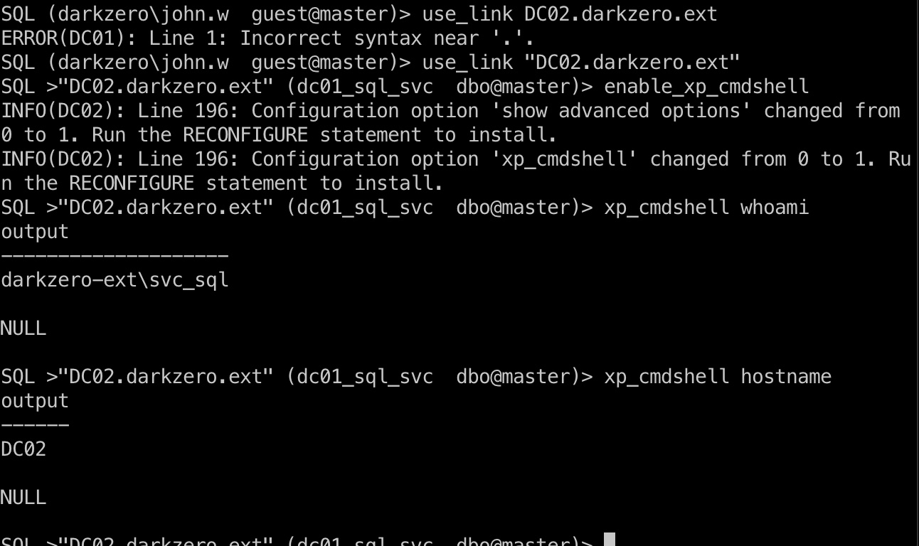 $ nmap -sC -sV -Pn 10.10.11.89 Starting Nmap 7.95 ( https://nmap.org ) at 2025-10-08 15:35 JST Nmap scan report for 10.10.11.89 Host is up (0.19s latency). Not shown: 988 filtered tcp ports (no-response) PORT STATE SERVICE VERSION 53/tcp open domain Simple DNS Plus 88/tcp open kerberos-sec Microsoft Windows Kerberos (server time: 2025-10-08 13:10:52Z) 139/tcp open netbios-ssn Microsoft Windows netbios-ssn 389/tcp open ldap Microsoft Windows Active Directory LDAP (Domain: darkzero.htb0., Site: Default-First-Site-Name) | ssl-cert: Subject: commonName=DC01.darkzero.htb | Subject Alternative Name: othername: 1.3.6.1.4.1.311.25.1:<unsupported>, DNS:DC01.darkzero.htb | Not valid before: 2025-07-29T11:40:00 |_Not valid after: 2026-07-29T11:40:00 |_ssl-date: TLS randomness does not represent time 445/tcp open microsoft-ds? 464/tcp open kpasswd5? 593/tcp open ncacn_http Microsoft Windows RPC over HTTP 1.0 636/tcp open ssl/ldap Microsoft Windows Active Directory LDAP (Domain: darkzero.htb0., Site: Default-First-Site-Name) |_ssl-date: TLS randomness does not represent time | ssl-cert: Subject: commonName=DC01.darkzero.htb | Subject Alternative Name: othername: 1.3.6.1.4.1.311.25.1:<unsupported>, DNS:DC01.darkzero.htb | Not valid before: 2025-07-29T11:40:00 |_Not valid after: 2026-07-29T11:40:00 1433/tcp open ms-sql-s Microsoft SQL Server 2022 16.00.1000.00; RTM |_ms-sql-ntlm-info: ERROR: Script execution failed (use -d to debug) |_ssl-date: 2025-10-08T13:12:17+00:00; +6h33m14s from scanner time. | ssl-cert: Subject: commonName=SSL_Self_Signed_Fallback | Not valid before: 2025-10-08T13:10:02 |_Not valid after: 2055-10-08T13:10:02 |_ms-sql-info: ERROR: Script execution failed (use -d to debug) 3268/tcp open ldap Microsoft Windows Active Directory LDAP (Domain: darkzero.htb0., Site: Default-First-Site-Name) |_ssl-date: TLS randomness does not represent time | ssl-cert: Subject: commonName=DC01.darkzero.htb | Subject Alternative Name: othername: 1.3.6.1.4.1.311.25.1:<unsupported>, DNS:DC01.darkzero.htb | Not valid before: 2025-07-29T11:40:00 |_Not valid after: 2026-07-29T11:40:00 3269/tcp open ssl/ldap Microsoft Windows Active Directory LDAP (Domain: darkzero.htb0., Site: Default-First-Site-Name) | ssl-cert: Subject: commonName=DC01.darkzero.htb | Subject Alternative Name: othername: 1.3.6.1.4.1.311.25.1:<unsupported>, DNS:DC01.darkzero.htb | Not valid before: 2025-07-29T11:40:00 |_Not valid after: 2026-07-29T11:40:00 |_ssl-date: TLS randomness does not represent time 5985/tcp open http Microsoft HTTPAPI httpd 2.0 (SSDP/UPnP) |_http-title: Not Found |_http-server-header: Microsoft-HTTPAPI/2.0 Service Info: Host: DC01; OS: Windows; CPE: cpe:/o:microsoft:windows