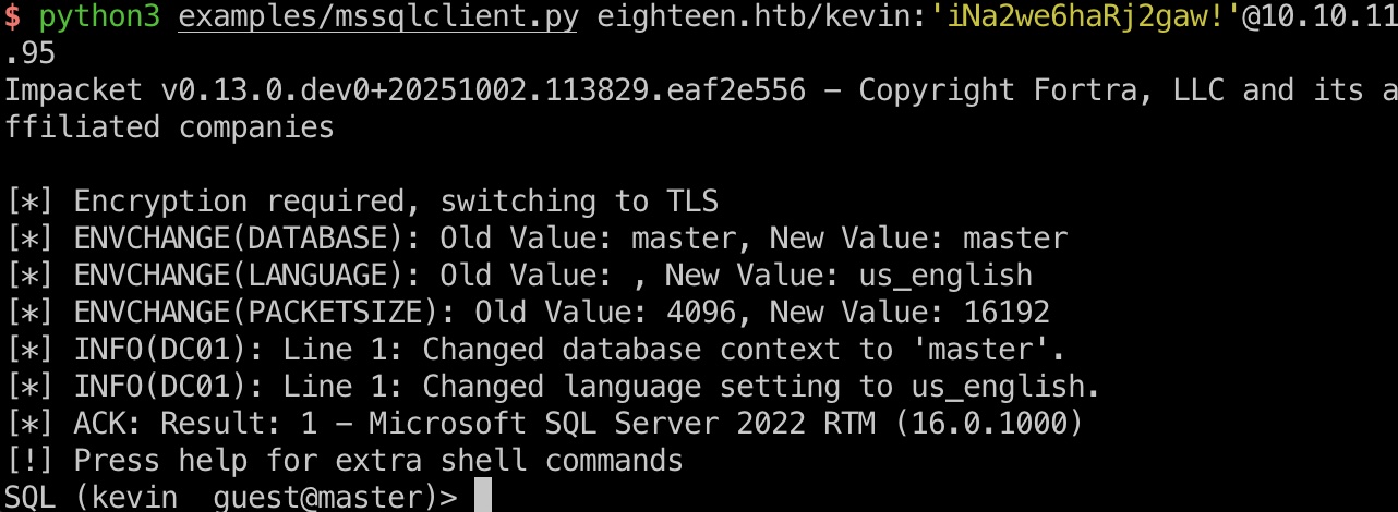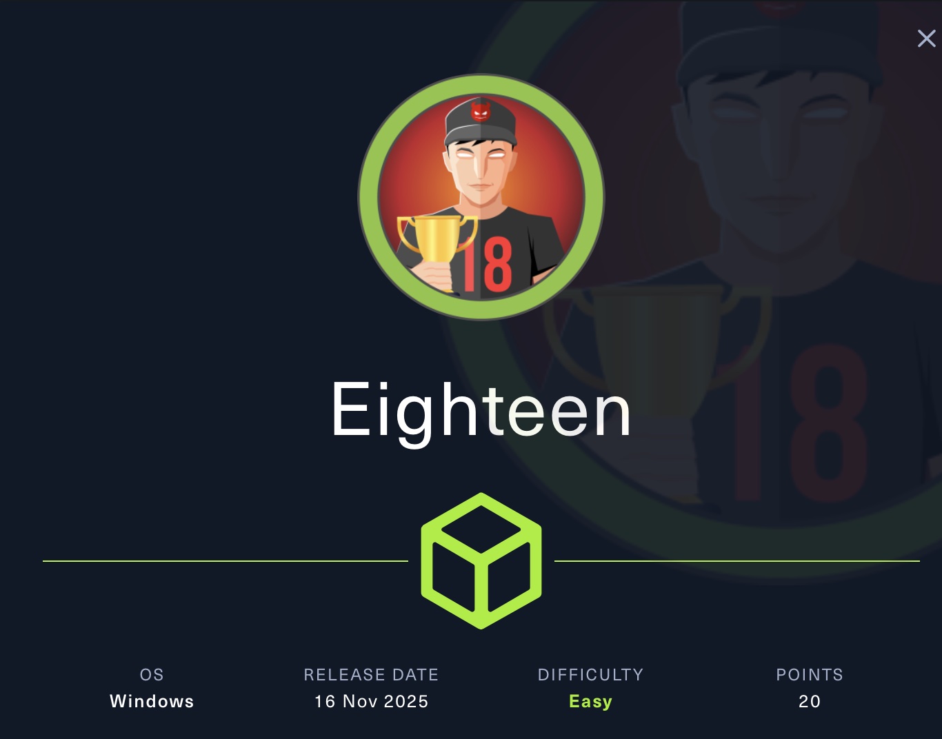 As is common in real life Windows penetration tests, you will start the Eighteen box with credentials for the following account: kevin / iNa2we6haRj2gaw!