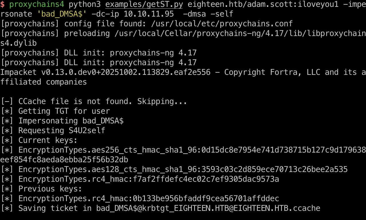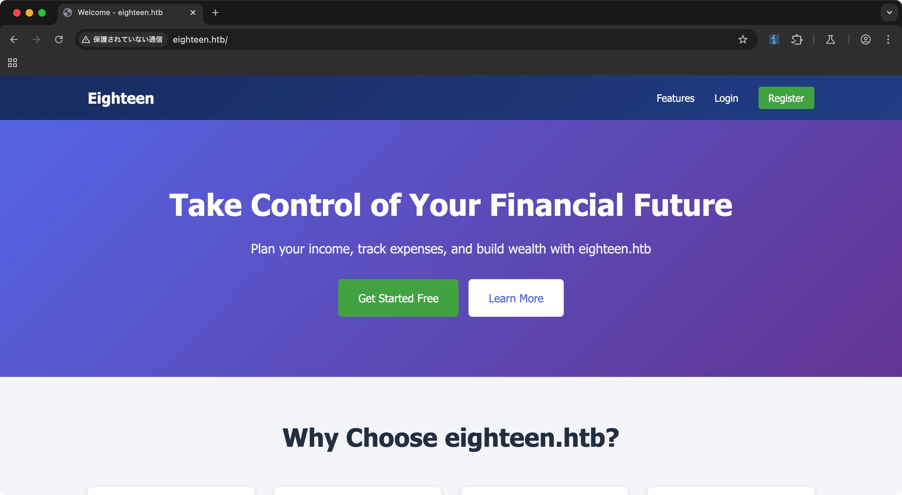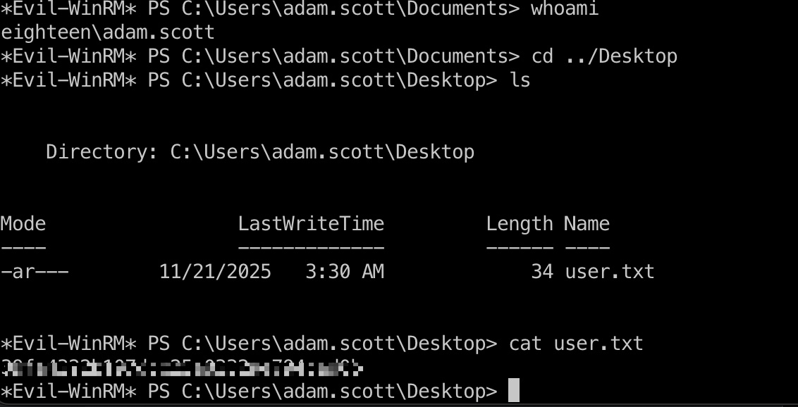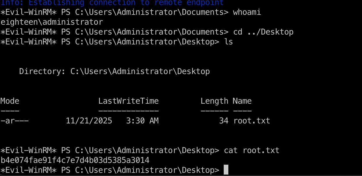 $ nmap -sC -sV -Pn 10.10.11.95 Starting Nmap 7.95 ( https://nmap.org ) at 2025-11-21 20:08 JST Nmap scan report for 10.10.11.95 Host is up (0.19s latency). Not shown: 997 filtered tcp ports (no-response) PORT STATE SERVICE VERSION 80/tcp open http Microsoft IIS httpd 10.0 |_http-server-header: Microsoft-IIS/10.0 |_http-title: Did not follow redirect to http://eighteen.htb/ 1433/tcp open ms-sql-s Microsoft SQL Server 2022 16.00.1000.00; RTM | ssl-cert: Subject: commonName=SSL_Self_Signed_Fallback | Not valid before: 2025-11-21T11:31:42 |_Not valid after: 2055-11-21T11:31:42 |_ms-sql-info: ERROR: Script execution failed (use -d to debug) |_ms-sql-ntlm-info: ERROR: Script execution failed (use -d to debug) |_ssl-date: 2025-11-21T17:41:51+00:00; +6h31m25s from scanner time. 5985/tcp open http Microsoft HTTPAPI httpd 2.0 (SSDP/UPnP) |_http-server-header: Microsoft-HTTPAPI/2.0 |_http-title: Not Found Service Info: OS: Windows; CPE: cpe:/o:microsoft:windows